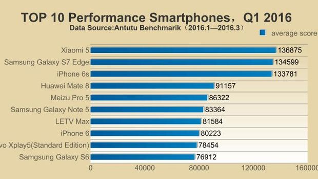 Di posisi puncak ada Xiaomi Mi 5. Prosesor dan RAM yang dimilikinya sama seperti Galaxy S7 Edge. Namun sebagai catatan resolusi layarnya masih Full HD, sementara ponsel besutan Samsung mengusung 2K.