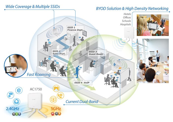 WAP 1750 memiliki kapasitas high-density hingga 100 user client secara simultan (50 user untuk frekuensi 2.4 GHZ dan 50 pada frekuensi 5Ghz). Sehingga cukup ideal untuk tempat kerja yang mendukung solusi BYOD (Bring Your On Devices) atau lingkungan lain dengan volume user dan perangkat nirkabel yang tinggi.