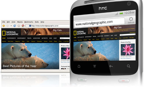 Tampilan browsing di HTC ChaCha (sebelah kanan) yang dibandingkan dengan tampilan kala diakses via komputer (sebelah kiri)