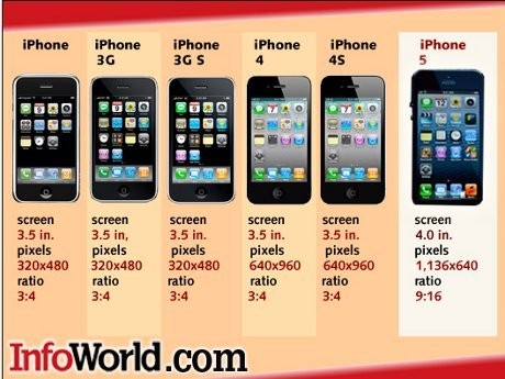 β’ iPhone 5: 4,0 inch diagonal, 640 x 1.136 pixels (Retina display), rasio 9:16