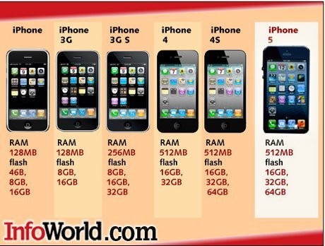 β’ iPhone 5: 512MB RAM; 16GB, 32GB, dan 64GB flash storage