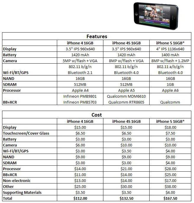 Berikut tabel perkiraan harga produksi iPhone 5 dengan iPhone 4 dan iPhone 4S dengan memori 16 GB.