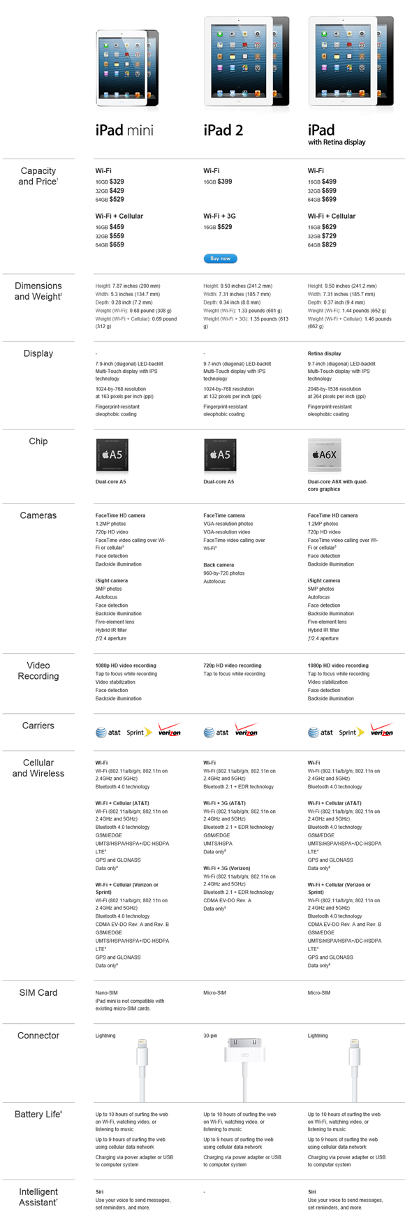 Perbedaan lainnya adalah, dock conector lightning di iPad Mini sedangkan iPad 2 tidak. Sedangkan untuk iPad Mini versi selular sudah menggunakan nano SIM, iPad 2 tidak. Tak dipasangkan pula Siri di iPad 2, di iPad Mini malah sudah.