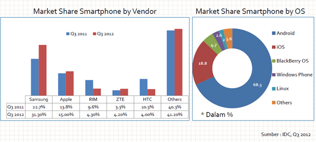 Sementara untuk skala vendor, Samsung masih menjadi 'raja' smartphone dunia dengan menguasai pangsa pasar sekitar 31,3%, meninggalkan Apple dan RIM dengan 15% dan 4,3%.