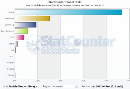 Untuk kategori khusus smartphone, memang StatCounter tak mengeluarkan risetnya secara terpisah. Tapi dari statistik yang dilihat, Research in Motion -- sekarang bernama BlackBerry, menguasai hingga 5% di bawah Sony Ericsson dan di atas Apple dengan 1,7%.