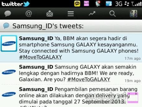 Samsung Indonesia Promosikan BBM untuk Galaxy - detikInet Kamis, 19 Sep 2013 15:57 WIB Tautan telah disalin @Samsung_ID (fyk/detikINET) Jakarta - (yud/tyo) Tautan telah disalin