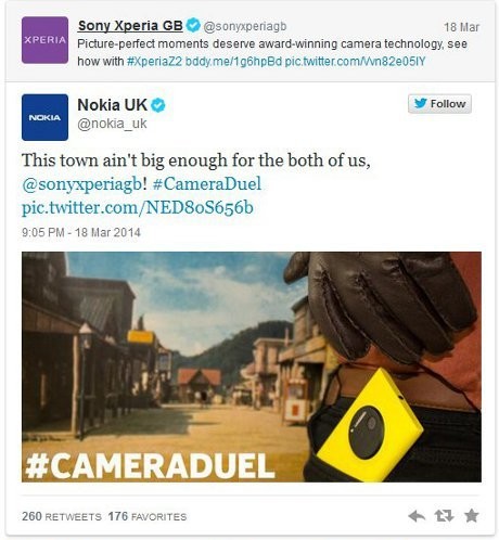 Ya, perang Twitter terjadi di Inggris antara akun Sony dengan Nokia. Awalnya, Sony mempromosikan kamera Xperia Z2 di Twitter dengan kalimat yang kurang lebih menyatakan bahwa momen berharga harus dijepret dengan teknologi kamera Xperia Z2 yang bagus.