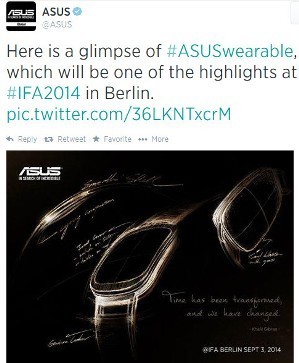 Hal itu diungkapnya di akun Twitter resmi miliknya. Dalam kicauannya, @ASUS menampilkan sketsa gambar sebuah smartwatch yang sangat mungkin adalah wearable gadget yang siap dirilis.