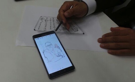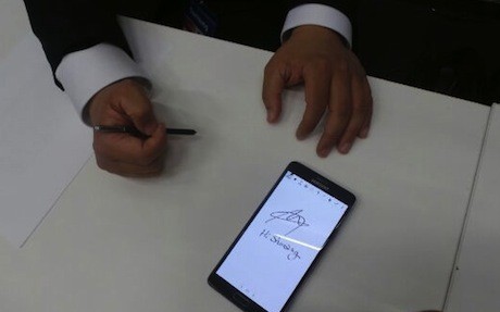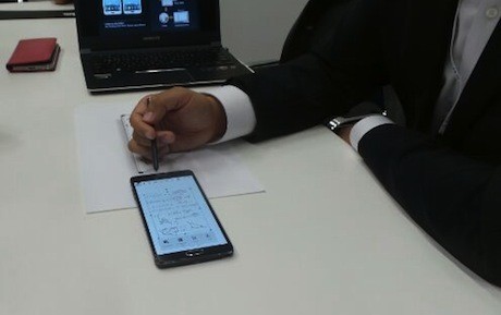 Saat diperagakan, sebuah tulisan di kertas dengan Galaxy Note 4. Kemudian setelah difoto, dengan mudah tulisan di kertas itu diproses menjadi tulisan di note Anda.
