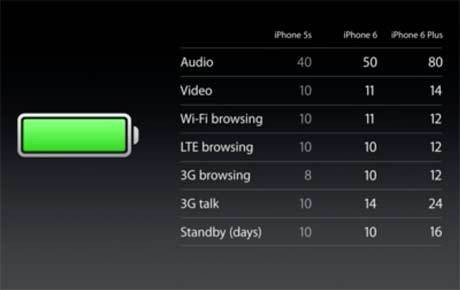 Untuk mendengarkan musik, berbanding 40 jam untuk iPhone 5S, 50 jam iPhone 6 4,7 inch dan 80 jam iPhone 6 Plus.