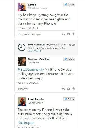 "Rambutku terus saja terjebak di celah antara layar dengan alumunium di iPhone 6 milikku," demikian tulis pengguna iPhone 6 bernama Kavan di Twitter.