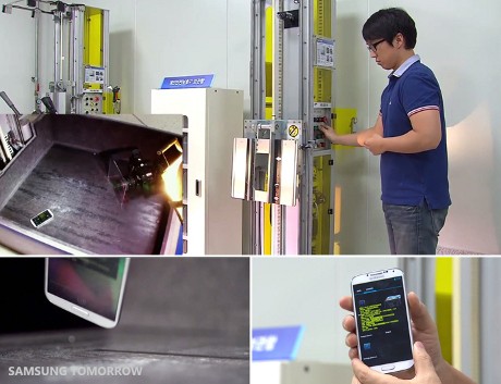 Diperlihatkan pula bagaimana sebuah gelas keramik hancur berkeping-keping ketika dijatuhkan dengan cara serta ketinggian yang sama. Di dalam sebuah alat, Note 4 juga dilempar kesana kemari. Namun Samsung menunjukkan, Note 4 tetap baik baik saja.