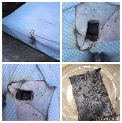 Ledakan itu bahkan sampai membolongi kasur tempat ponsel tersebut diletakkan. Dalam gambar terlihat kasur yang dimaksud gosong terbakar pada lubangnya. Untungnya tak ada yang terluka dalam kejadian ini.