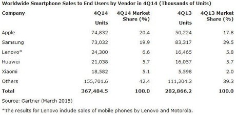 Menariknya, data yang dirilis Gartner sedikit berbeda dengan yang dirilis oleh Strategy Analytics beberapa waktu lalu. Menurut mereka, pangsa pasar Apple dan Samsung pada kuartal empat 2014 berada di posisi yang sama, yaitu 20%.