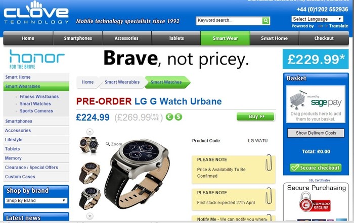 Halaman web Clove turut menampilkan harga jual jam tangan berbasis Android Wear tersebut. LG Watch Urbane dibandrol seharga GBP225 atau sekitar Rp 4,3 juta. (GDP1 = Rp 19415).