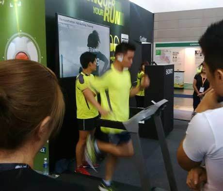 Saat peluncuran Smart B Trainer di Sports and Fitness Asia 2015 di Singapore Expo Convention and Exhibition Centre, Kamis (11/6/2015), staf Sony memberikan petunjuk penggunaan alat tersebut.