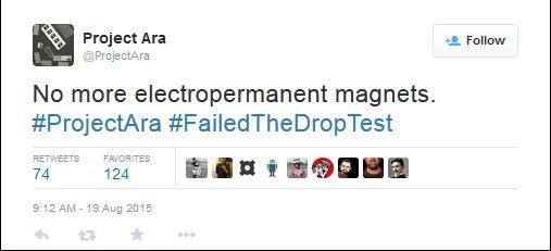 Project Ara -- nama proyek ponsel modular tersebut -- ditunda karena mengalami kegagalan dalam drop test yang dilakukan terhadap ponsel itu. Fakta ini didapat dari tweet yang dilontarkan @ProjectAra.
