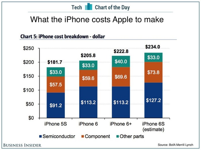 Bank of America Merrill Lynch coba menganalisis berapakah harga asli iPhone 6S berdasarkan biaya komponen. Menurut mereka, iPhone 6S versi 64 GB membutuhkan biaya pembuatan sekitar USD 234 saja atau di kisaran Rp 3,3 juta.