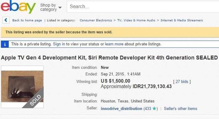 Penjualnya adalah seorang developer yang mengaku punya dua unit Apple TV yang baru dirilis pada awal September lalu di San Francisco, Amerika Serikat. Dan ia menjual satu dari dua unit tersebut melalui eBay.