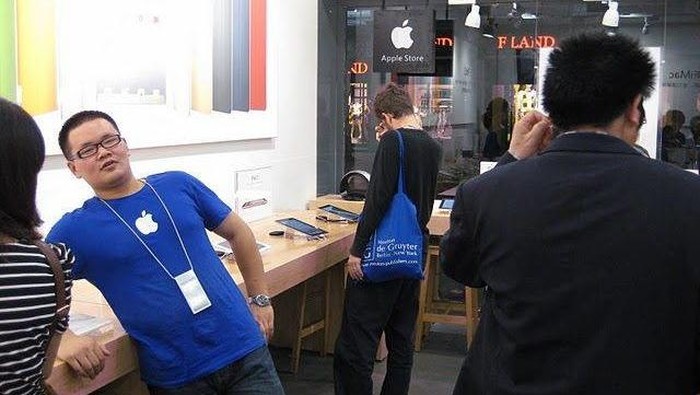 Tapi itu belum seberapa, karena demi semakin memastikan konsumen percaya, Apple Store abal-abal ini juga memberi seragam yang sama persis seperti yang dipakai karyawan Apple Store asli kepada para penjaga tokonya.