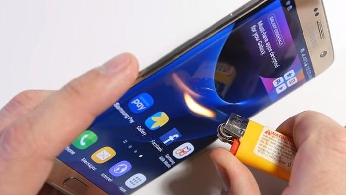 Menurutnya, jangan pernah mendekatkan layar smartphone dengan api karena pasti akan berubah putih permanen dan tidak dapat diperbaiki. Terakhir, ia melakukan uji ketahanan bodi S7 dengan cara dibengkokkan.