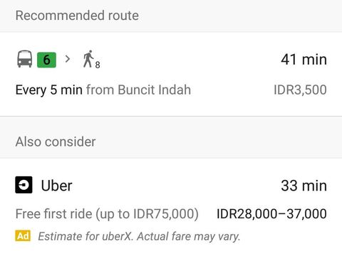 Sebenarnya fitur yang memberikan alternatif Uber sebagai moda transportasi selain TransJakarta dan CommuterLine bukanlah hal yang sama sekali baru yang ditawarkan oleh Google Maps. Namun kali ini Google menambahkannya dengan prediksi tarif yang harus dibayar.