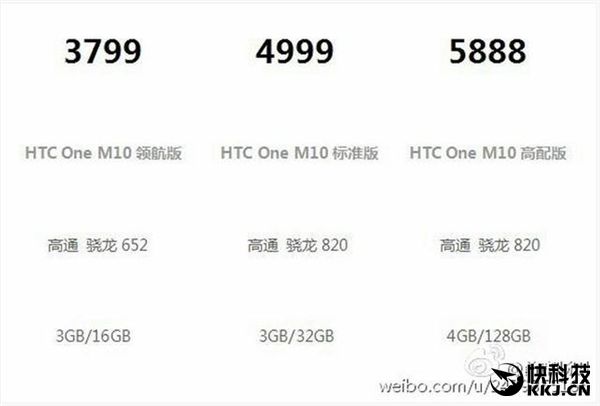 Hal tersebut diketahui dari bocoran foto harga HTC One M10 yang beredar di laman media sosial asal China, Weibo. Dalam foto itu disebutkan, One M10 akan hadir dalam tiga varian dengan spesifikasi berbeda-beda.