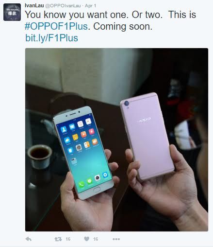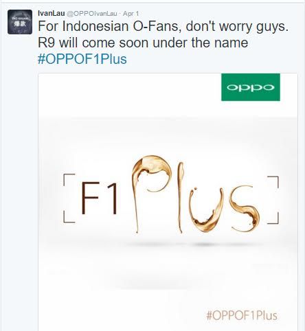 "For Indonesian O-Fans, don't worry guys. R9 will come soon under the name #OPPOF1Plus", ujar Ivan melalui akun @OPPOIvanLau.