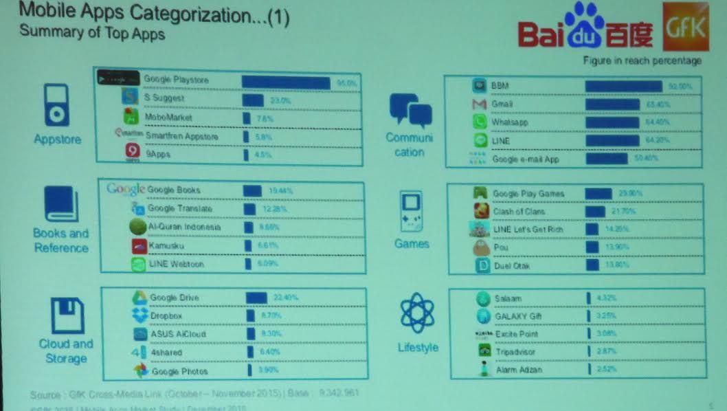"Meski perangkat BlackBerry sudah jarang digunakan, ternyata BBM terlihat di sini masih sangat banyak digunakan oleh pengguna smartphone," ujar Iwan Setiawan, Marketing Manager Baidu Indonesia, di Jakarta, Kamis (7/4/2016).