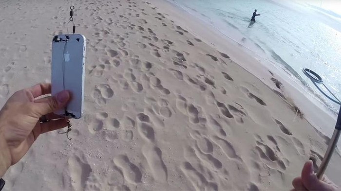 Ia meletakkan iPhone 5 yang rusak itu di atas mata pancing. Tanpa memasang umpan lain pada joran, sang pria coba melemparkannya ke lautan.