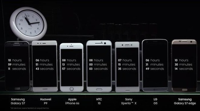 Sebuah video menampilkan uji durasi ketahanan baterai ponsel flagship. Adapun perangkat dites ada tujuh, yakni Samsung Galaxy S7 dan S7 Edge, Huawei P9, iPhone 6S, HTC 10, Sony Xperia X dan LG G5.