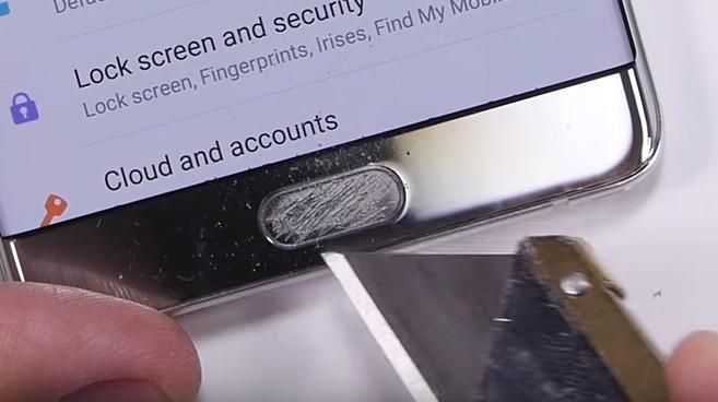 Selanjutnya, Jerry menggunakan pisau cutter untuk menggores di sejumlah bagian. Pada tombol home terjadi bekas goresan. Dan kondisi tersebut membuat sensor sidik jari bermasalah.