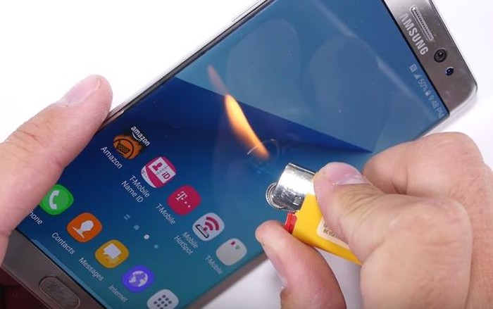Tes berikutnya layar ponsel coba dibakar mengunakan korek api. Setelah 8 detik, layar Galaxy Note 8 timbul putih. Hebatnya dalam waktu singkat kembali normal ketika sumber panas dipindahkan.