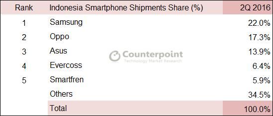 Demikian terungkap dalam penelitian terbaru oleh biro riset Counterpoint Research. Penelitian tersebut dilakukan di kuartal II 2016 atau dari bulan Juli sampai sekarang.