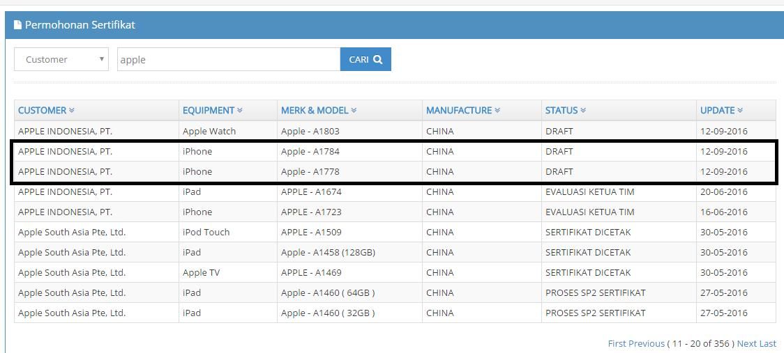 Adapun dua perangkat tersebut berkode Apple-A1784 dan Apple-A1784. Kedua perangkat didaftarkan PT Apple Indonesia dan masuk dalam status draft.