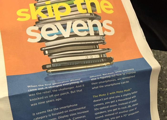 Ya, itulah yang disampaikan Lenovo di iklan terbarunya. Iklan yang beredar di surat kabar di Amerika Serikat itu bertajuk 'Skip the Sevens'. Menurut Lenovo, ketimbang membeli S7, Note 7 atau iPhone 7, lebih baik meminang Motorola Moto Z yang diklaim inovatif.