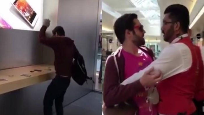 Tanpa basa basi, pria tersebut langsung mencabut iPhone yang dipajang, lalu memukulnya dengan bole besi satu persatu. Tidak puas meluluhlantakkan belasan ponsel, pria yang mengenakan kacamata hitam itu lanjut menghancurkan iMac dan Macbook.