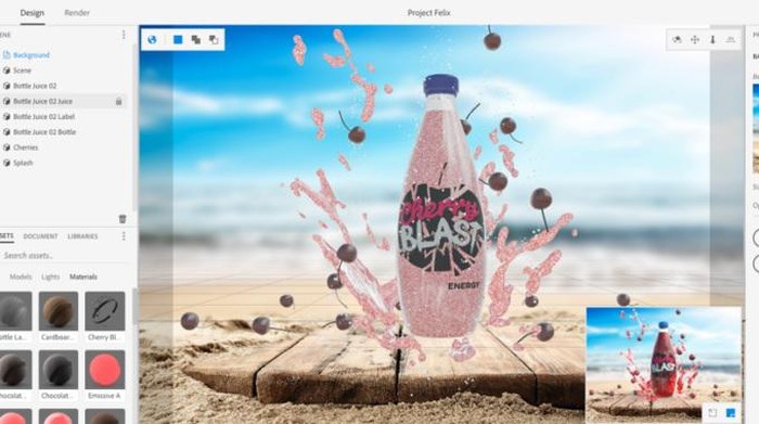 Objek 3D yang dibuat dapat ditempatkan pada latar belakang apapun. Agar tampil lebih realitis, Adobe menggunakan mesin rendering V-Ray.