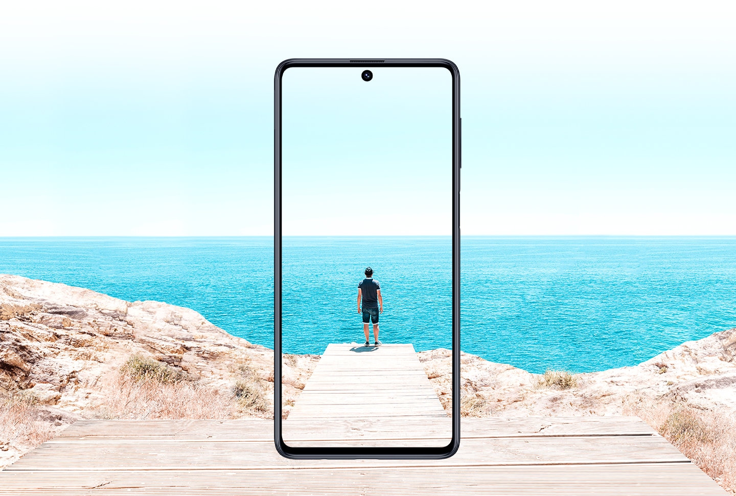 Posisi punch hole sama-sama berada di tengah bagian atas. Demikian pula sensor fingerprint yang oleh Samsung ditempatkan di tombol power.