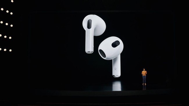 Dalam acara peluncuran yang diselenggarakan secara online, Selasa dini hari (19/10/2021), Apple menghadirkan AirPods 3 dengan desain seperti AirPods Pro hanya tanpa eartips. Desain kontur baru menghadirkan suara langsung ke telinga pengguna.