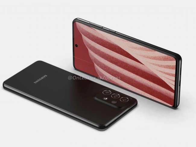 Render Galaxy A73 memperlihatkan ponsel dengan modul kamera berbentuk persegi panjang yang memuat empat kamera belakang dan flash LED. Di bagian tengah layar terdapat punch-hole yang memuat kamera depan.