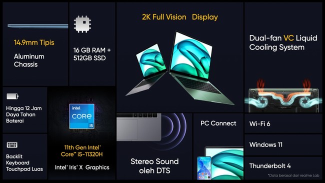 "Semua peningkatan terkait dengan pemakaian prosesor yang baru, yaitu Intel Core i5-11320H. Lalu kenapa kami meningkatkan pendinginnya? Karena dengan begitu kinerja prosesor bisa dimaksimalkan," ujar Andy Carney, Product Marketing Manager Realme Global, saat acara peluncuran, Kamis (14/4/2022).