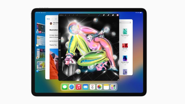 Untuk pertama kalinya di iPad, pengguna dapat membuat jendela yang tumpang tindih dengan ukuran berbeda dalam satu tampilan, menyeret dan melepas jendela dari samping, atau membuka aplikasi dari Dock untuk membuat grup aplikasi sehingga multitasking yang lebih cepat dan lebih fleksibel.