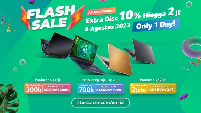 Di ajang ini Acer juga memberikan sejumlah penawaran menarik seperti diskon hingga Rp 6 juta, program cicilan dengan bunga 0%, program Live Sale untuk penjualan online dan bonus untuk pembelian langsung. Seluruh pembelian laptop Acer tipe apapun selama periode Acer Day berhak mendapatkan 1 (satu) tahun perlindungan Accidental Damage Protection (ADP).