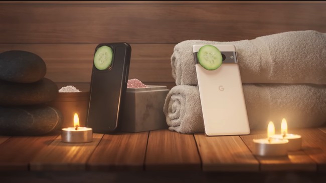 Dalam iklan terbarunya yang bertajuk 'Spa Day', Google menampilkan sebuah iPhone berwarna hitam dan Pixel berwarna putih yang sedang bersantai di sauna. Bagian kamera belakang ponsel itu ditutupi irisan timun yang terus melorot.