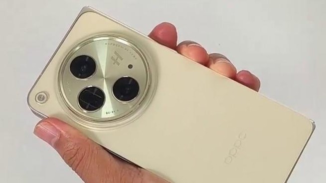 Dari foto tersebut, dapat dilihat Oppo Find N3 warna emas memiliki panel belakang yang dilapisi kaca. Di bagian tengahnya terdapat modul kamera berbentuk bulat yang cukup besar, lengkap dengan logo Hasselblad.