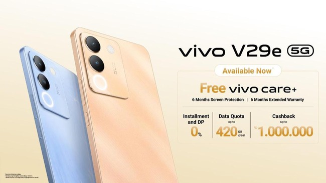 Vivo V29e mulai dijual Kamis (2/11) lalu dengan harga Rp 4.399.000 untuk varian 8GB/256GB. Ada promosi apa saja ya?
