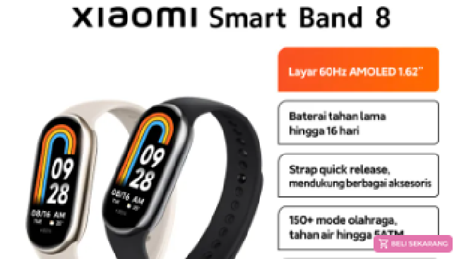 Xiaomi menghadirkan Smart Band 8 sebagai smart watch berukuran kecil yang sangat modis untuk digunakan dalam keseharian. Walau berukuran kecil, Smart Band 8 juga dibekali layar AMOLED berbentuk pil 1,62 inch dengan refresh rate 60 hz yang dapat memanjakan penggunanya.