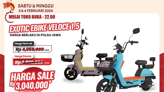 Salah satunya adalah sepeda listrik Exotic E-Bike Veloce 1.5. Harga promo E-Bike ini di luar Pulau Jawa adalah Rp 5.250.000 yang promo menjadi Rp 4.100.000. Jika menggunakan Allo Prime, Allo Paylater, kartu kredit Bank Mega atau Bank Mega Syariah maka pelanggan bisa mendapatkan sepeda tersebut mulai dari Rp 3.280.000.