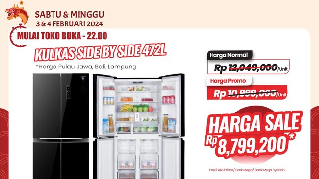 Sedangkan harga normal kulkas ini di luar Pulau Jawa, Bali dan Lampung masih sama di Rp 12.649.000 namun dengan promo pengguna dapat membelinya di harga Rp 11.549.000 Jika menggunakan Allo Prime, Allo Paylater, kartu kredit Bank Mega atau Bank Mega Syariah maka pelanggan bisa mendapatkan TV tersebut mulai dari Rp 9.239.000. Artinya pelanggan setia hemat Rp 3.410.000 dari harga normal.